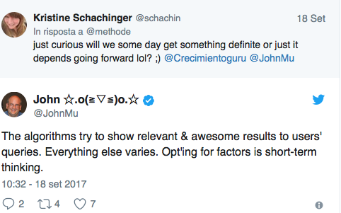 Che, tradotto in italiano, significa: “Gli algoritmi [di Google] provano a mostrare risultati rilevanti e entusiasmanti in risposta alle query degli utenti. Tutto il resto [fattori di ranking] è variabile. Ottimizzare [le proprie pagine web] in funzione dei fattori di ranking è un approccio miope.”